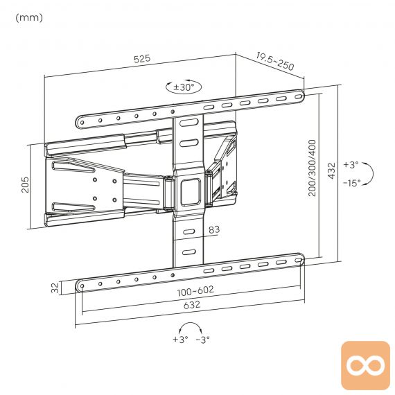 Stenski nosilec KM1308 je bil zasnovan tako, da lahko televizor popolnoma prilagodite svojim potrebam. Na voljo imate široke navpične in vodoravne nastavitve ter poravnavo v območju od +3° do -3° vodoravno.