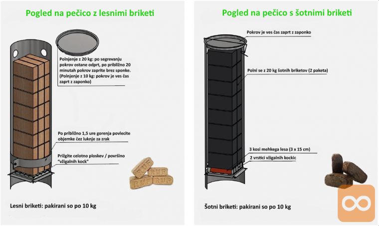 – Šotni briketi (10 kg pakiranje) – daljša doba gorenja
