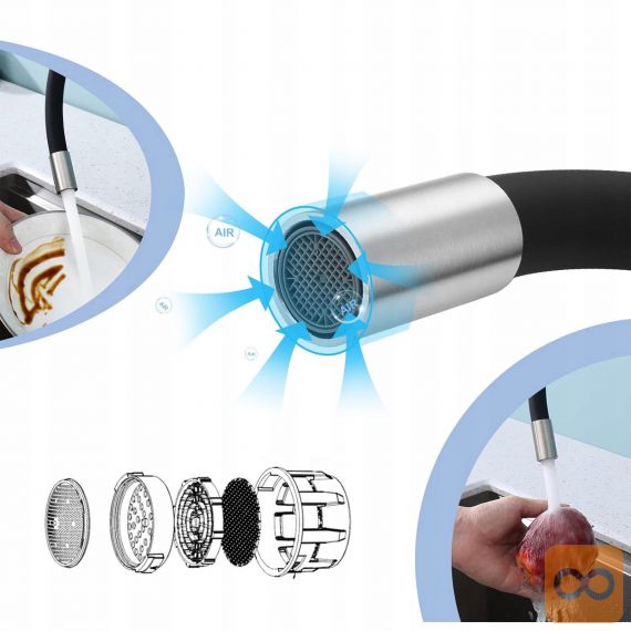 Aerator na koncu izliva meša vodo z zrakom, kar zmanjša porabo vode za do nekaj deset odstotkov. Nežen, enakomeren curek preprečuje brizganje in povečuje udobje, hkrati pa varčuje z viri.