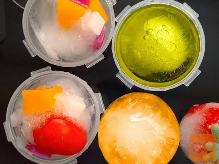 Pijača z ledeno kroglico in zamrznjenim sadjem izgleda zelo zanimivo , po stopitvi pa v kozarec prijetne temperature pristane svež sadni ali zeliščni dodatek. Kroglice so precej velike, zato vašo pijačo ohranijo hladno dlje časa. kul!