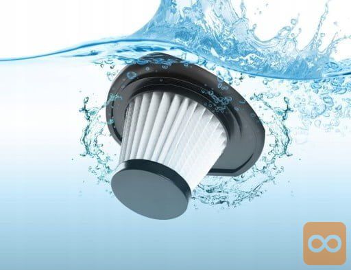 - DVOJNI FILTRIRNI SISTEM – HEPA filter, ki se nahaja v notranjosti , preprečuje izpihovanje najmanjšega prahu , dezinficira zrak, ki gre skozi njega, in dodatno ščiti motor naprave pred poškodbami. Zahvaljujoč uporabi filtra sesalnik ne izgubi svoje moči in njegova sesalna moč ostane ves čas nespremenjena. Lahko se enostavno odstrani in opere pod tekočo vodo.