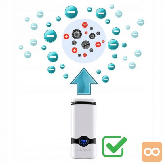 • IONIZATOR – zmanjša nam škodljive ione (pozitivne ione) s proizvodnjo negativnih ionov – vse onesnaženje pade na podlago, namesto da bi potovalo v naša pljuča; zrak postane lahek in svež , in tako? Naše razpoloženje se takoj izboljša! Ne počutimo se nenehno utrujeni, zaspani ipd. Ionizator bo odlična rešitev predvsem za alergike, astmatike, pa tudi za ljudi, ki se pritožujejo zaradi stalnih glavobolov. Zrak, ki ga dihamo, je zelo škodljiv za naše zdravje, vpliva na celotno telo in je odgovoren za stanje naše kože, las in pljuč. Najbolj nevarno je vse, kar ni vidno s prostim očesom – prah in pršice, malokdo izmed nas ve, da so električni aparati (telefon, TV, računalnik, mikrovalovna pečica, pralni stroj in številni drugi) velik problem, pozitivni ioni proizvajajo zelo negativno vplivajo na naše telo, zato je tako pomembno, da sebi in svoji družini zagotovite varen in zdrav zrak, ki ga zagotavlja ionizator – na kvaliteto zunanjega zraka ne moremo vplivati, vendar lahko zrak, ki ga dihamo doma, v veliki meri spremeni vlažilec zraka z ionizacijsko funkcijo. Naprava ima tudi funkcijo aromaterapije.