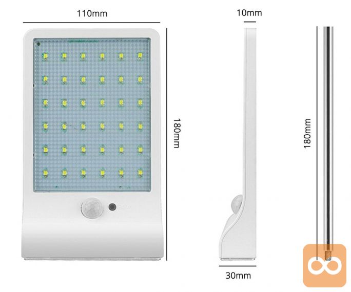 - Napajanje: solarni panel + vgrajena baterija 3,7 V 1200 mAh