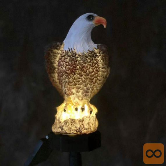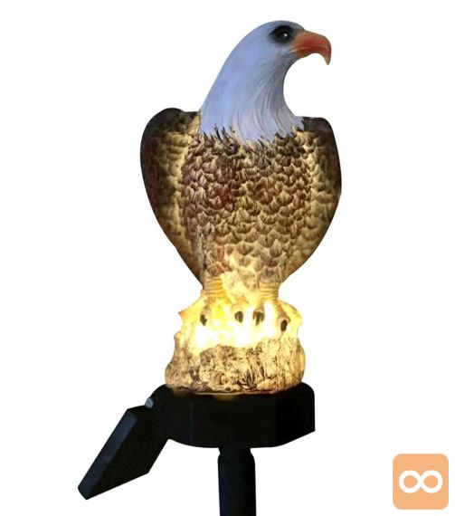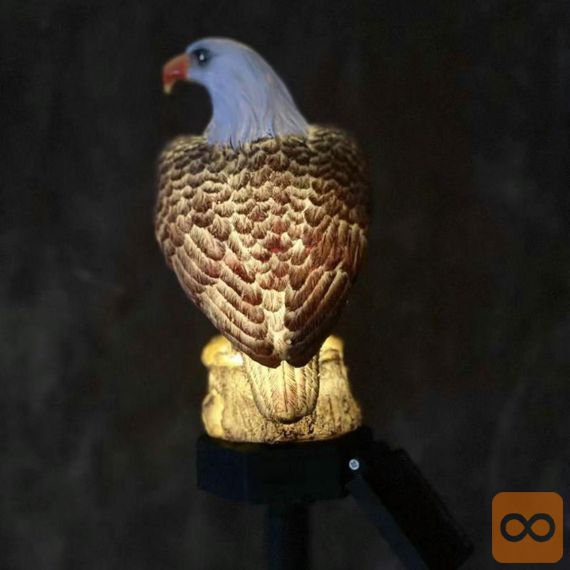 Nenavadna, solarna LED vrtna svetilka v obliki orla. Odličen dekorativni element. Svetilka se napaja s sončno energijo, ki s pomočjo solarne plošče polni vgrajeno polnilno baterijo. Naprava se samodejno zažene, ko se zmrači (opremljena je s senzorjem mraka), polna baterija pa zadošča za do 8 ur neprekinjenega delovanja. Svetilka ima LED, ki oddaja belo svetlobo. Močna konica omogoča zanesljivo in hitro namestitev svetilke v tla, vodotesno ohišje pa zagotavlja nemoteno uporabo ne glede na vremenske razmere.