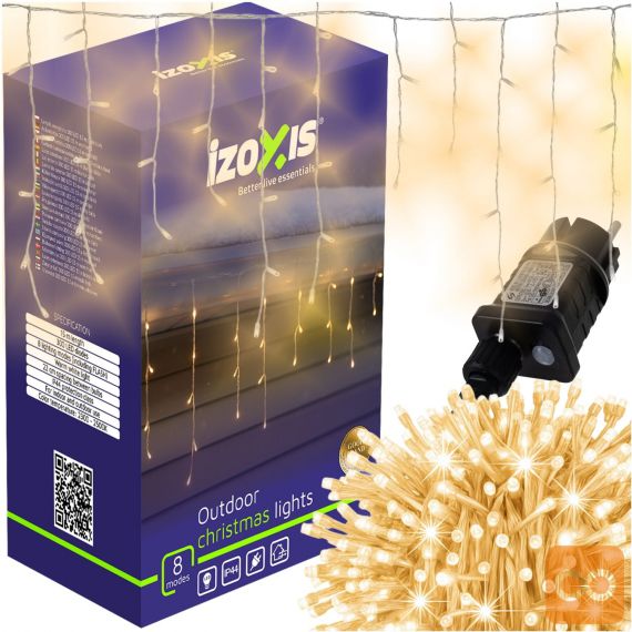 Zahvaljujoč 300 toplo belim LED diodam in dolžini 15 metrov bodo te luči IZOXIS ustvarile edinstveno vzdušje, polno svetlobe – bodisi v vaši dnevni sobi, na balkonu, terasi ali fasadi – 8 načinov osvetlitve, vključno z učinkom bliskavice, vam omogoča, da svetlobo prilagodite svojemu razpoloženju – od nežnega utripanja do prave praznične pojedine!