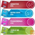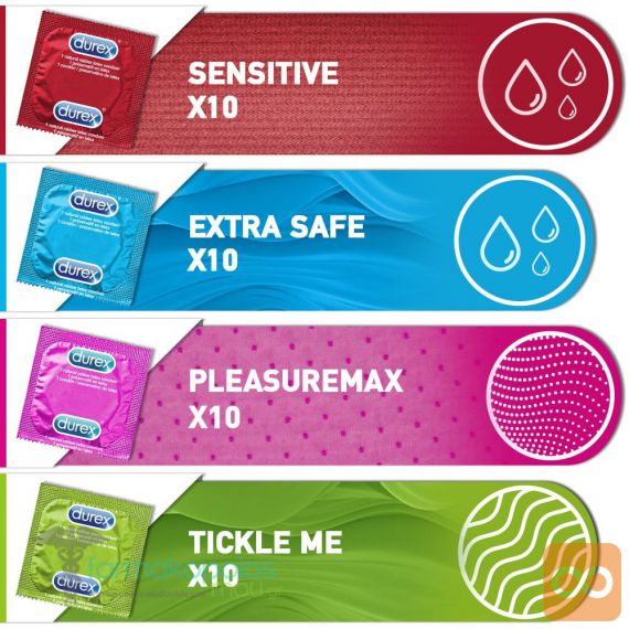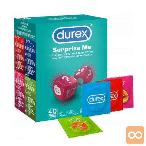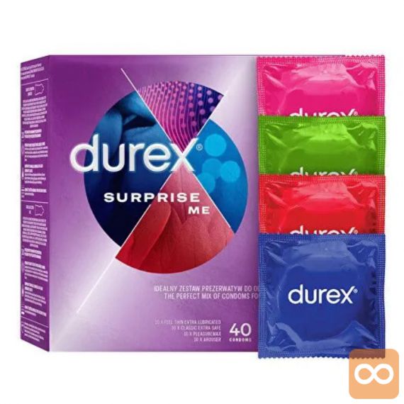 Komplet Suprise Me vključuje 40 Durex kondomov oziroma štiri različne tipe kondomov, primernih za različne priložnosti. S temi kondomi boste poskrbeli, da bo zaščita vedno na dosegu roke. Komplet Suprise Me vključuje kondome: Extra Safe, Tickle, Pleasuremax in Sensitive.