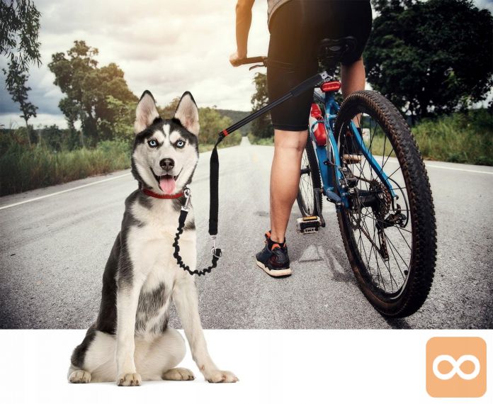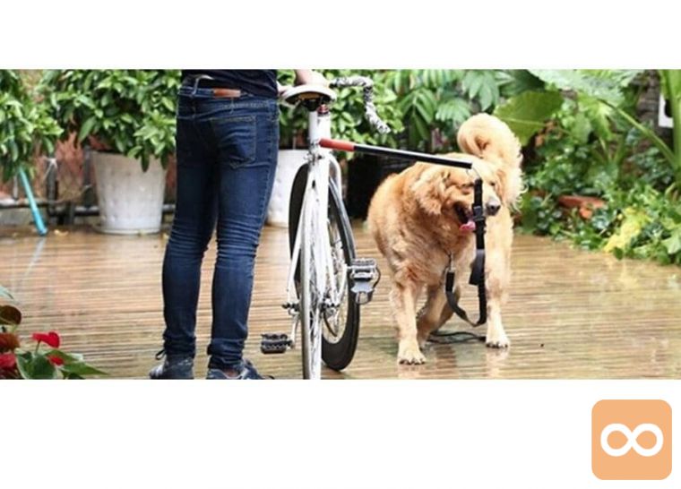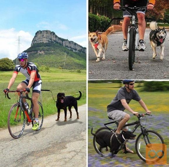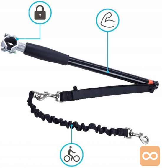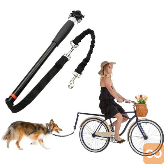 Povodec za pse z roko, pritrjen na sedežno oporo kolesa. Kovinska cev prave dolžine z močnim trakom bo poskrbela za varno razdaljo od kolesa in omogočila psu nemoten tek/sprehod.