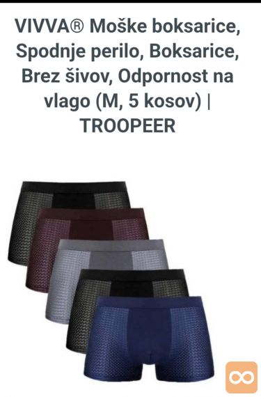 Prodam moške boksarice.Inf.o artiklu,glej slike*!<5 kom je v zavoju>Boksarice so nove in v tovarniški embalaži.So zelo elegantne za nositi in ne zadržujejo vlage''.Tudi sam jih imam več kosov in so odlične za uporabo.{5 kosov=15€}