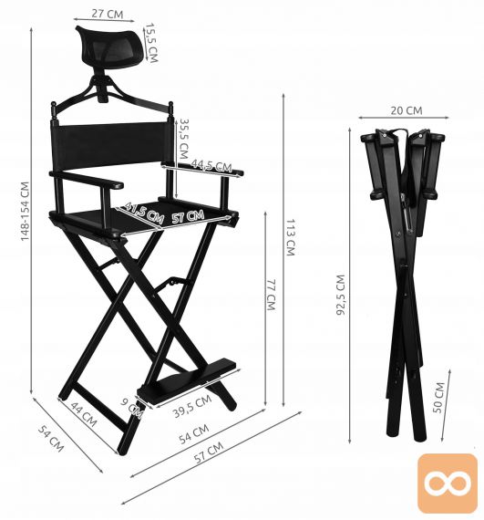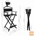 • STABILNA KONSTRUKCIJA – izdelek je izdelan iz aluminija in vodoodpornih materialov Oxford 600D. Ima močan okvir, ki zagotavlja udobje in varnost med uporabo. Odličen je kot oprema za profesionalne kozmetične salone, fotografske in filmske sete ter vizažiste. Stol je opremljen z naslonom za noge, na katerega lahko udobno naslonite noge, kar znatno izboljša udobje sedenja med nanašanjem ličil/karakterizacijo.