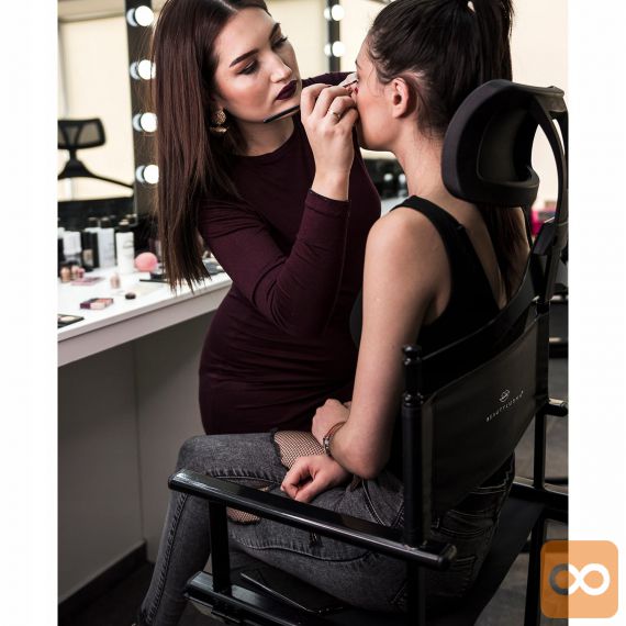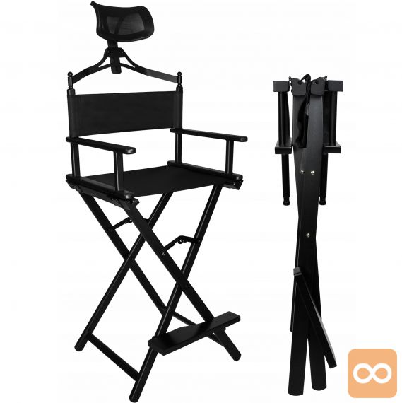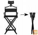 • ZLOŽLJIV LIČILNI STO Z VZGLAVNIKOM – Naš izjemno močan in udoben stol za ličenje, maskiranje in karakterizacijo igralcev, odlično pa bo služil tudi kot režiserski stol. Izdelan je iz črnega aluminija. Sedež je izdelan iz vodoodpornega materiala Oxford 600D. Poleg tega je stol opremljen z udobnim vzglavnikom, ki še poveča udobje med dolgimi sejami. Izdelek ima nosilnost do 140 kilogramov ! Nogice na dnu zagotavljajo stabilnost in varnost med uporabo.