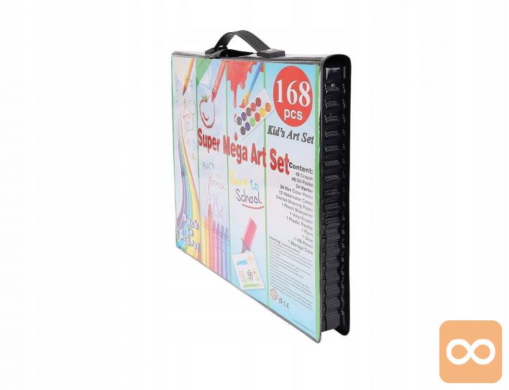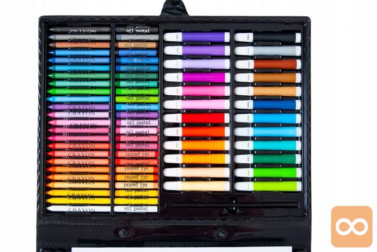 S pomočjo velike izbire 24 barvic, 24 flomastrov, 48 oljnih pastelov, 48 pastelov za sveče, 12 akvarelnih barv, šilčkov za svinčnike, lepila, korektorja, radirke, A4 listov, zlahka ustvarimo najbolj prefinjeno, ustvarjalna in izvirna dela. Posoda ima široko in privlačno paleto barv.