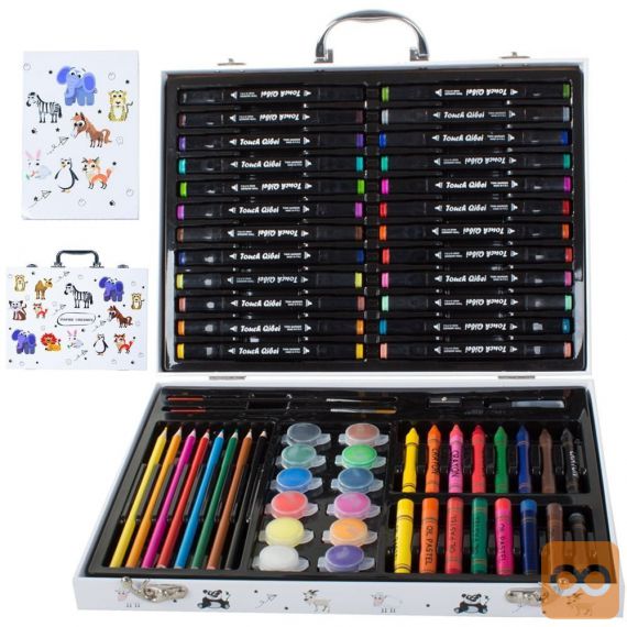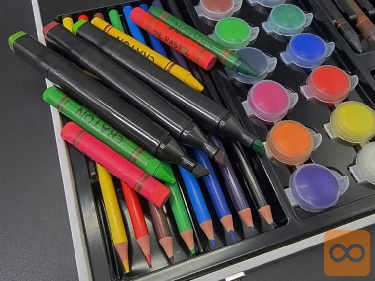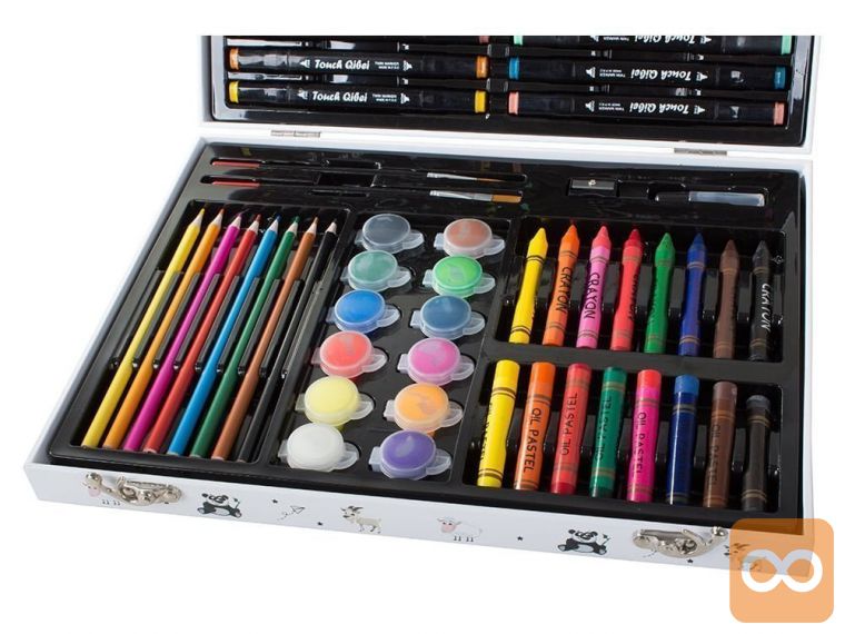Z izbiro tega velikega kompleta boste naenkrat prejeli vse potrebne potrebščine za mladega umetnika . Zahvaljujoč temu boste imeli priložnost preizkusiti različne tehnike ustvarjanja: od slikanja z barvami do risanja.