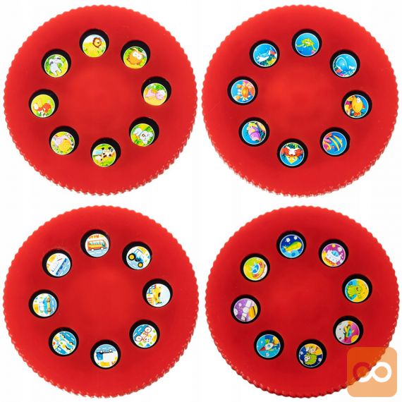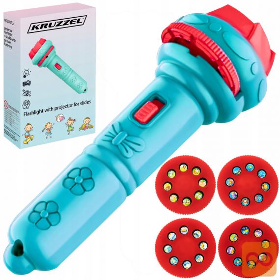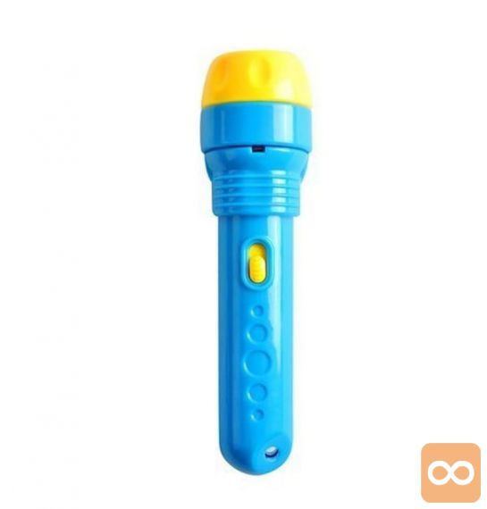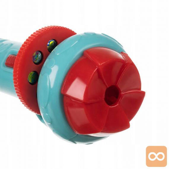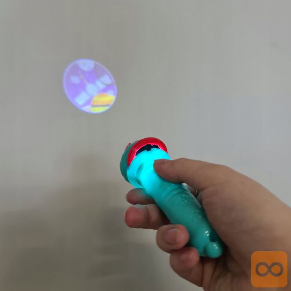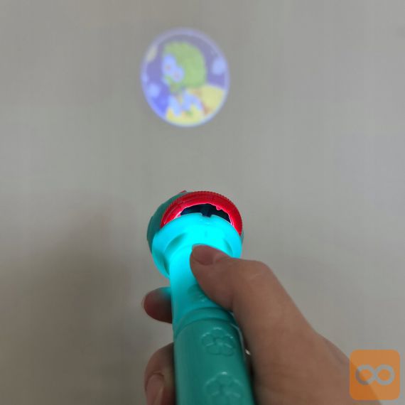 - IGRAČKA SVETILKA S PROJEKTORJEM – v kompletu je unikaten projektor v obliki priročne svetilke , ki se prilega tudi majhnemu ročaju. Ima 3 zamenljive ščite s slikami kopenskih, vodnih in vesoljskih živali . Projektor ima tudi gumb za ostrenje , tako da lahko slike prikažete z različnih razdalj. V kompletu so baterije , ki so priložene igrači, tako da lahko projektor prižgemo takoj po odprtju.