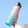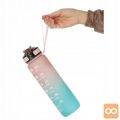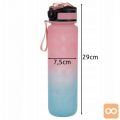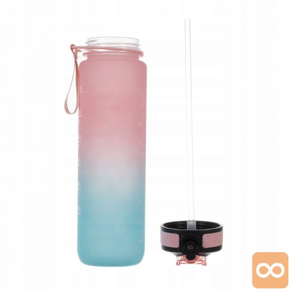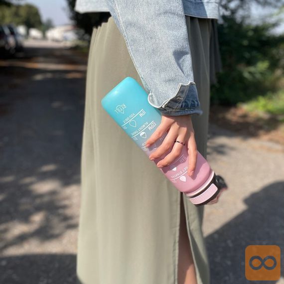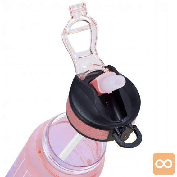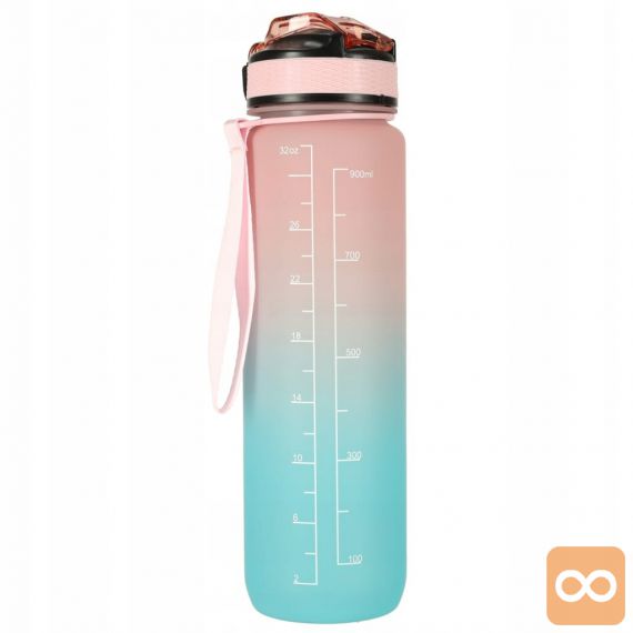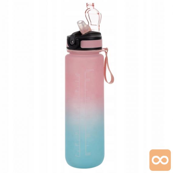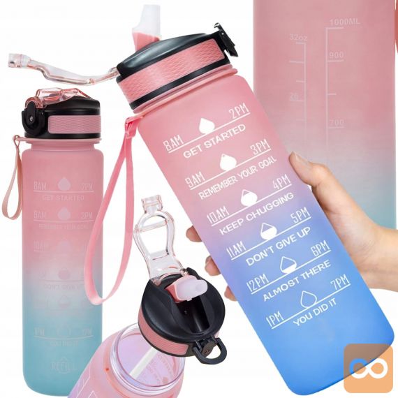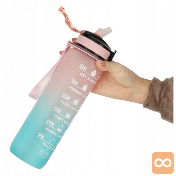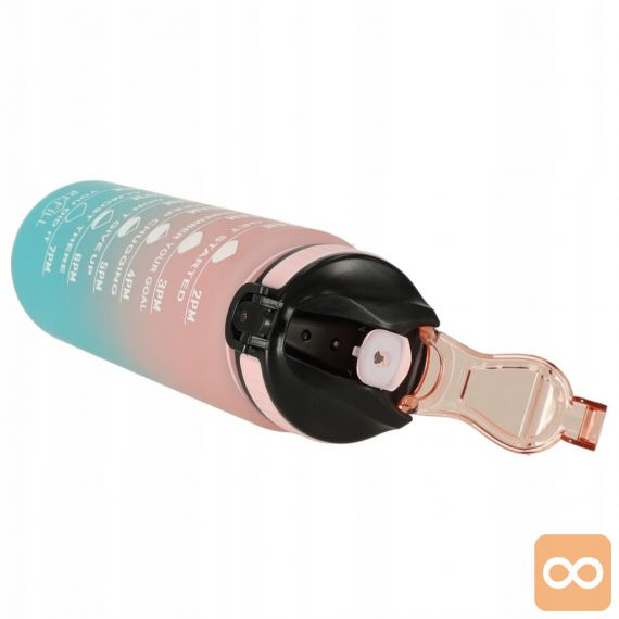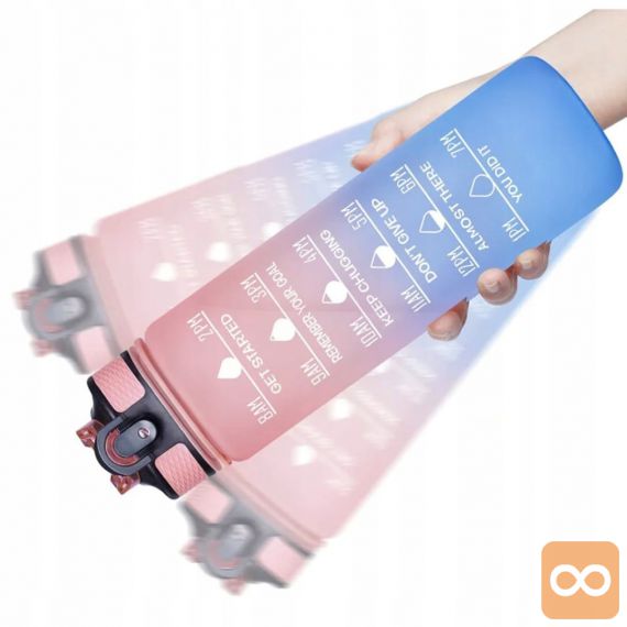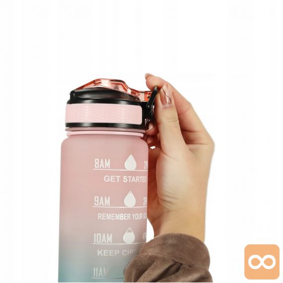 Zahvaljujoč prostornini 1 litra je popoln za potovanja, v pisarni ali telovadnici. Tudi ko je popolnoma napolnjen, ni težak, zahvaljujoč uporabi lahkega, a trpežnega tritana. Zanimiv dizajn z uro in slogani motivira k rednemu pitju vode čez dan. Varnostni zatič preprečuje nehoten pritisk na gumb za odpiranje steklenice.