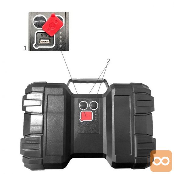 Svetilko napaja zmogljiva 10.000 mAh baterija , ki zadostuje za skoraj en dan neprekinjenega svetenja. Poleg tega je svetilka opremljena z USB priključkom , zahvaljujoč kateremu deluje kot Powerbank! Z njim lahko napolnite katero koli napravo – baterija zadostuje tudi za polno polnjenje baterije telefona!