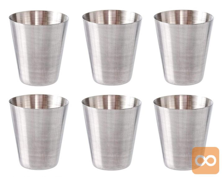 - Set 6 kozarcev s prostornino 30 ml je izdelan iz nerjavečega jekla, kar zagotavlja visoko vzdržljivost in dolgo življenjsko dobo.