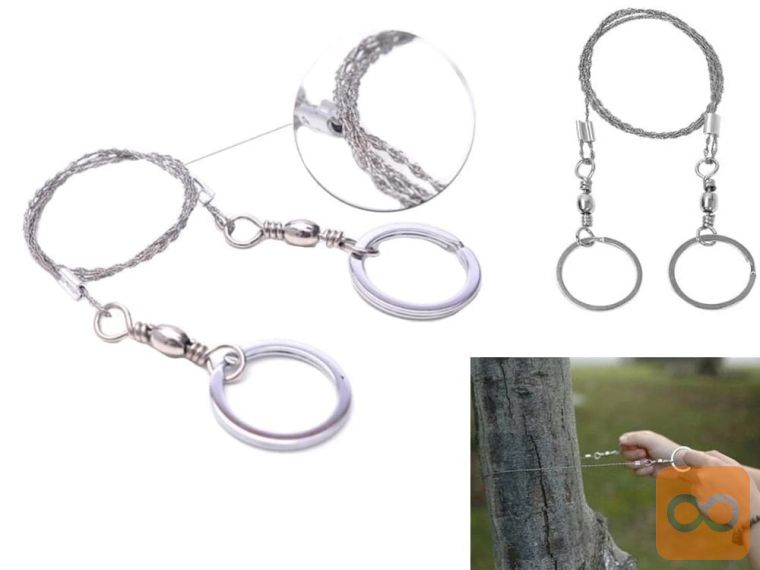 Žična žaga je orodje, ki vam bo omogočilo rezanje majhnih dreves za kurjavo in gradnjo zavetij v terenskih razmerah. Izdelan je iz trpežne jeklene žice, zaključene s kovinskimi obroči na obeh straneh. Te ročaje lahko uporabite za pritrditev predhodno pripravljenih lesenih palic , ki bodo olajšale delo in povečale udobje pri uporabi.