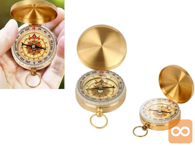 Bakren kompas s pokrovom na zaklepanje nam bo pokazal pravilen položaj in smer gibanja. Je majhen instrument s skalo, magnetno iglo in elegantno smerno vrtnico . Videti je kot majhna žepna ura. Enostavno, elegantno in stilsko . Vodoodporen, lahko se uporablja tudi v vodi.