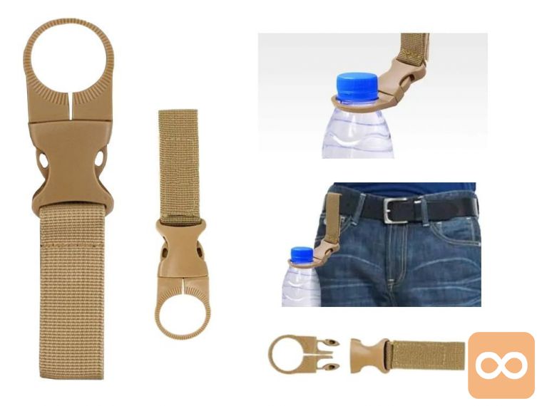 Držalo za potovalne steklenice. Enostavno ga pritrdite na zanko za pas, pas ali nahrbtnik. Zahvaljujoč ročaju ne potrebujemo dodatnega prostora v nahrbtniku ali torbi ali pa nahrbtnika sploh ne moremo vzeti s seboj, saj bo steklenica vedno pri roki , naše roke pa proste.