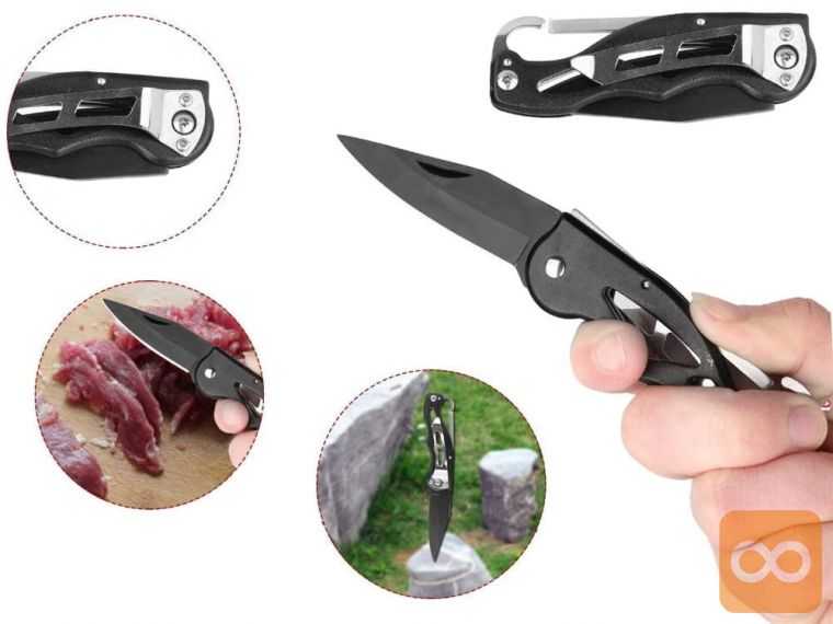 Ta nož je opremljen s posebno sponko , ki vam omogoča, da ga pritrdite na pas . Zahvaljujoč temu bo vedno pri roki. Skupna dolžina noža v raztegnjenem stanju je 16 cm.