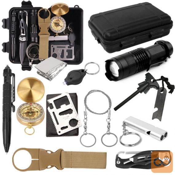 Komplet za preživetje 10 v 1 vsebuje veliko uporabnih orodij. Vse skupaj je zapakirano v praktično vodoodporno torbico , v katero lahko spravite vse priložene dodatke. Paket preživetja je zanimiva ideja za darilo za vsakogar, še posebej za tiste, ki jih zanima taborništvo ali turizem.