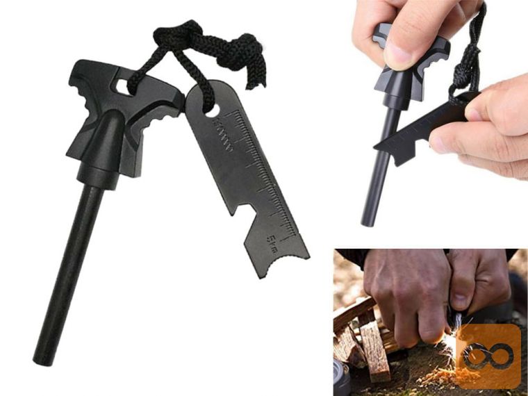 Praktični magnezijev kremenček . Izdelan je bil iz posebne magnezijeve zlitine. Vse skupaj je obešeno na vrvici . Iskre vam omogočajo zanetiti ogenj v vsakem vremenu in na kateri koli višini, tudi ko je kremen moker. Opremljen s krožnikom z odpiračem za steklenice in merilno skodelico.