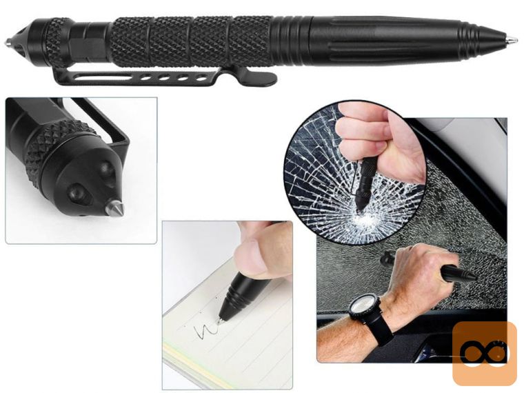 Vzdržljivo taktično pero iz aluminijeve zlitine, odporne na udarce, z zamenljivim polnilom, ki bo po potrebi služilo kot samoobrambno orodje.