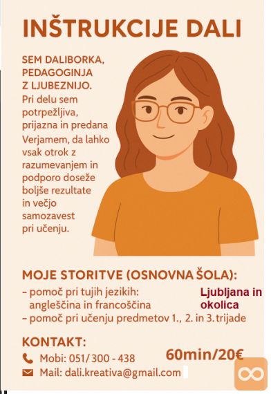 Nudim učno pomoč osnovnošolcem: domače naloge, seminarske, razumevanje učne snovi, priprava na kotrolne naloge, poleg tega inštruiram angleščino in francoščino za osnovnošolce. Sem pedagoginja v Ljubljani, osebno ali on-line. 1 ura - 60min/20€
