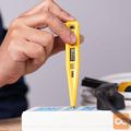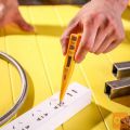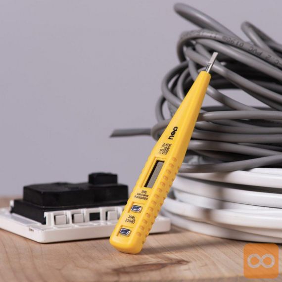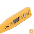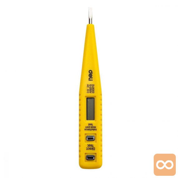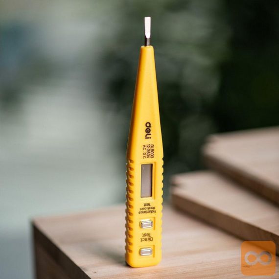 Tester napetosti znamke Deli v rumeni barvi. Zasnovan za monterje in serviserje elektro in elektrotehnične industrije. Označuje izmenično napetost v območju 12-250V. Trpežno ohišje naprave ima lahko berljiv, vgrajen zaslon. Tester ima vtičnico za testiranje kontaktov in induktivno testno vtičnico.