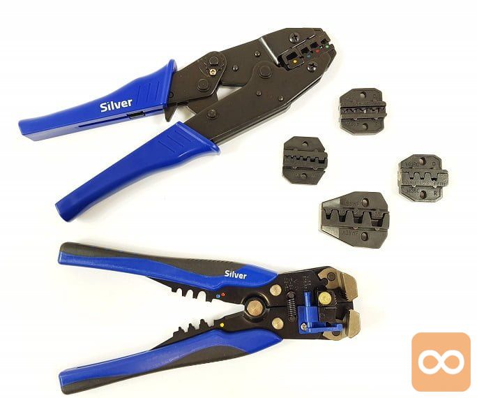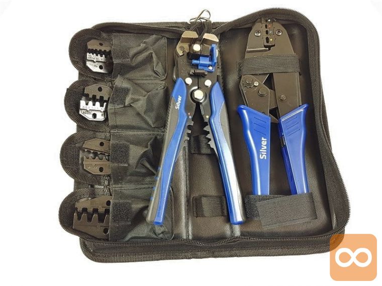 - Komplet sestavljajo klešče z avtomatskim, nastavljivim zaskočnim mehanizmom in zamenljive matrike, prilagojene petim vrstam elektrotehničnih konektorjev.