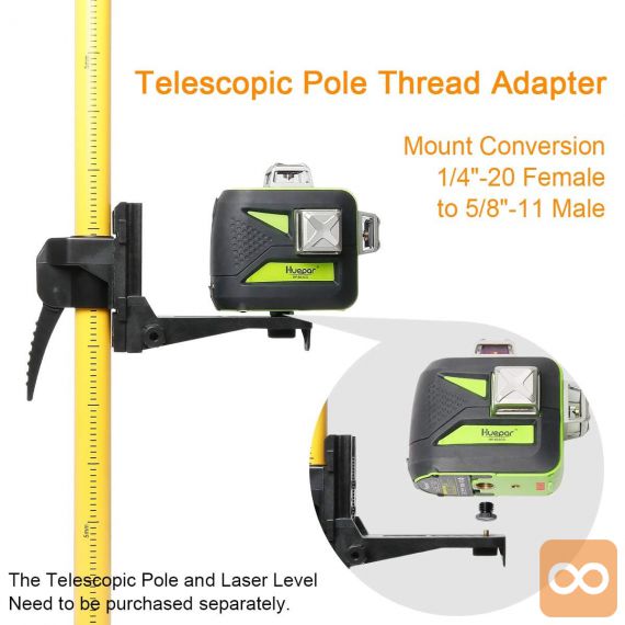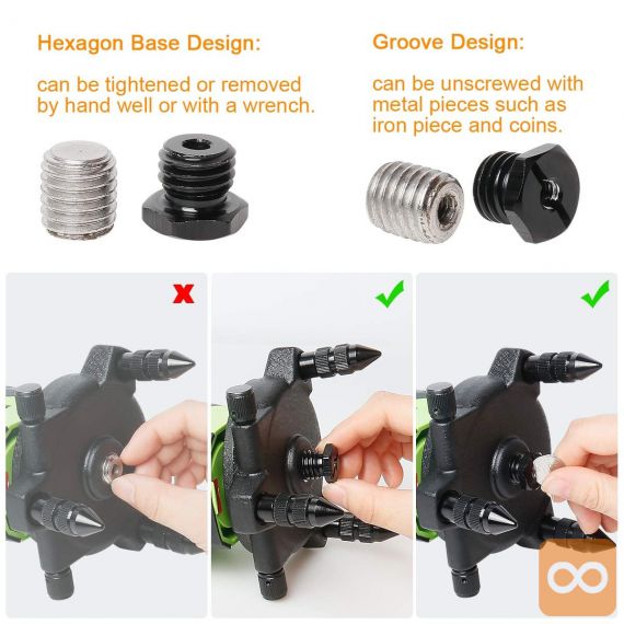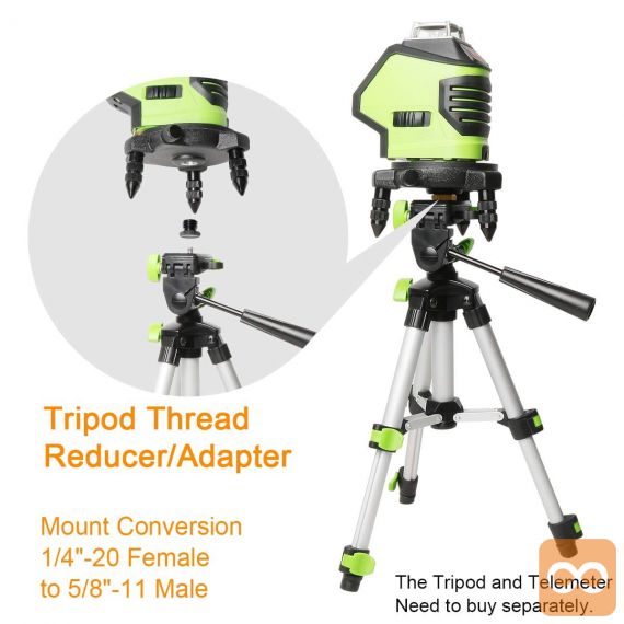 - Adapter za vijake vam omogoča, da laserski nivelir (z notranjim navojem 5/8”-11) povežete s stativom, lasersko montažno palico ali laserskim teleskopskim nosilcem (z moškim navojem 1/4”-20).